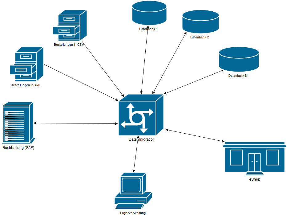 Mnoho firem provozuje více aplikací a často dospějí k problému, jak předávat data mezi těmito aplikacemi. Tento úkol je určen pro datovou migraci. Příklad aplikací: eShops, účetnictví, skladové hospodářství. Datová migrace zvládá vyčítat data ze zdroje, data transformovat a uložit do cílové aplikace. Na úrovni řádku a sloupečku může provádět různé transformace/změny/rozšíření. Příklad použití: vyčítání zákaznických objednávek z Amazonu a jajich uložení do účetnictví.