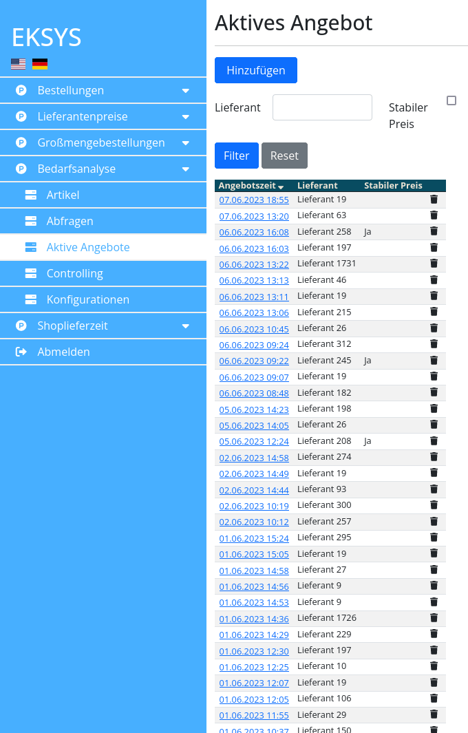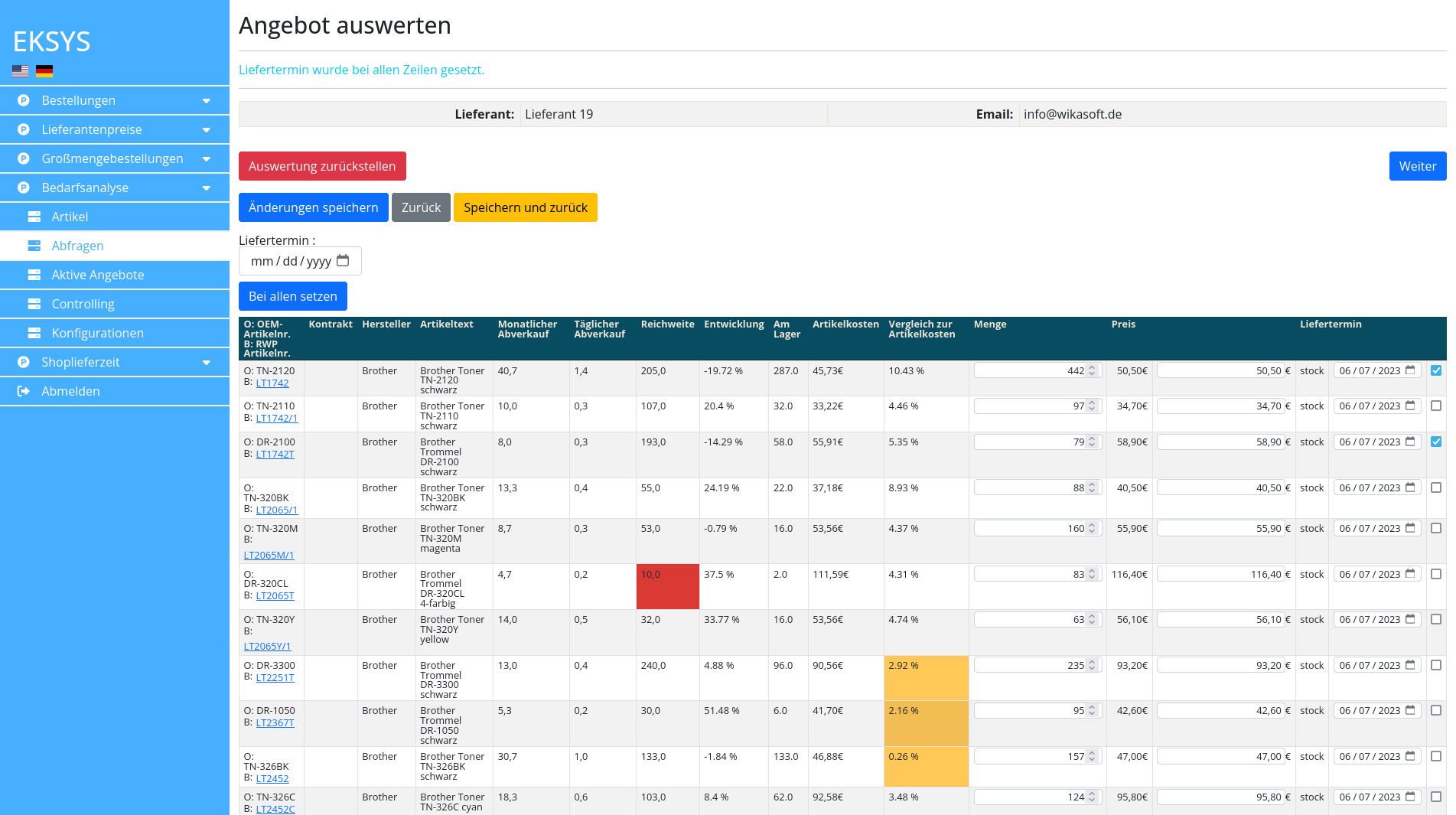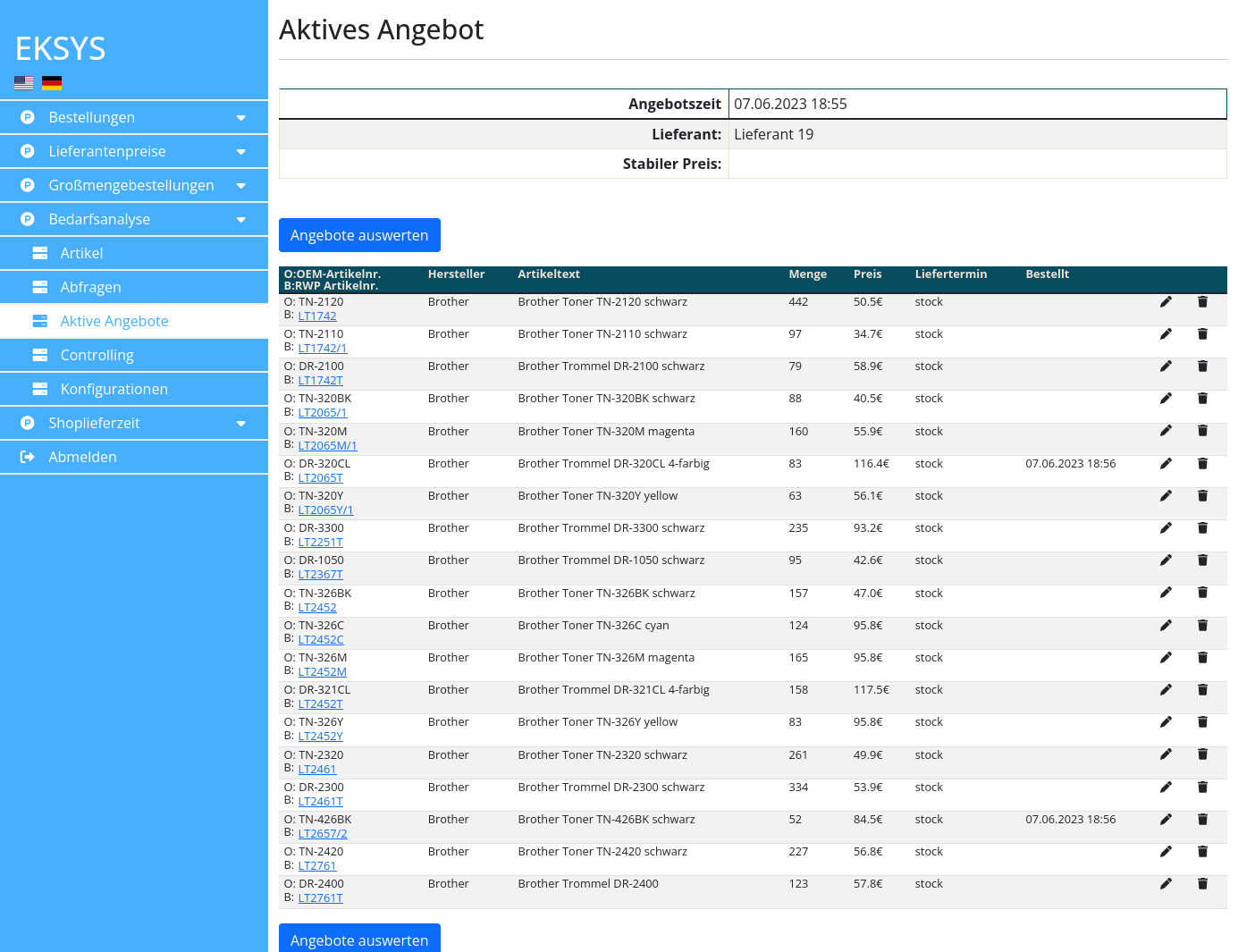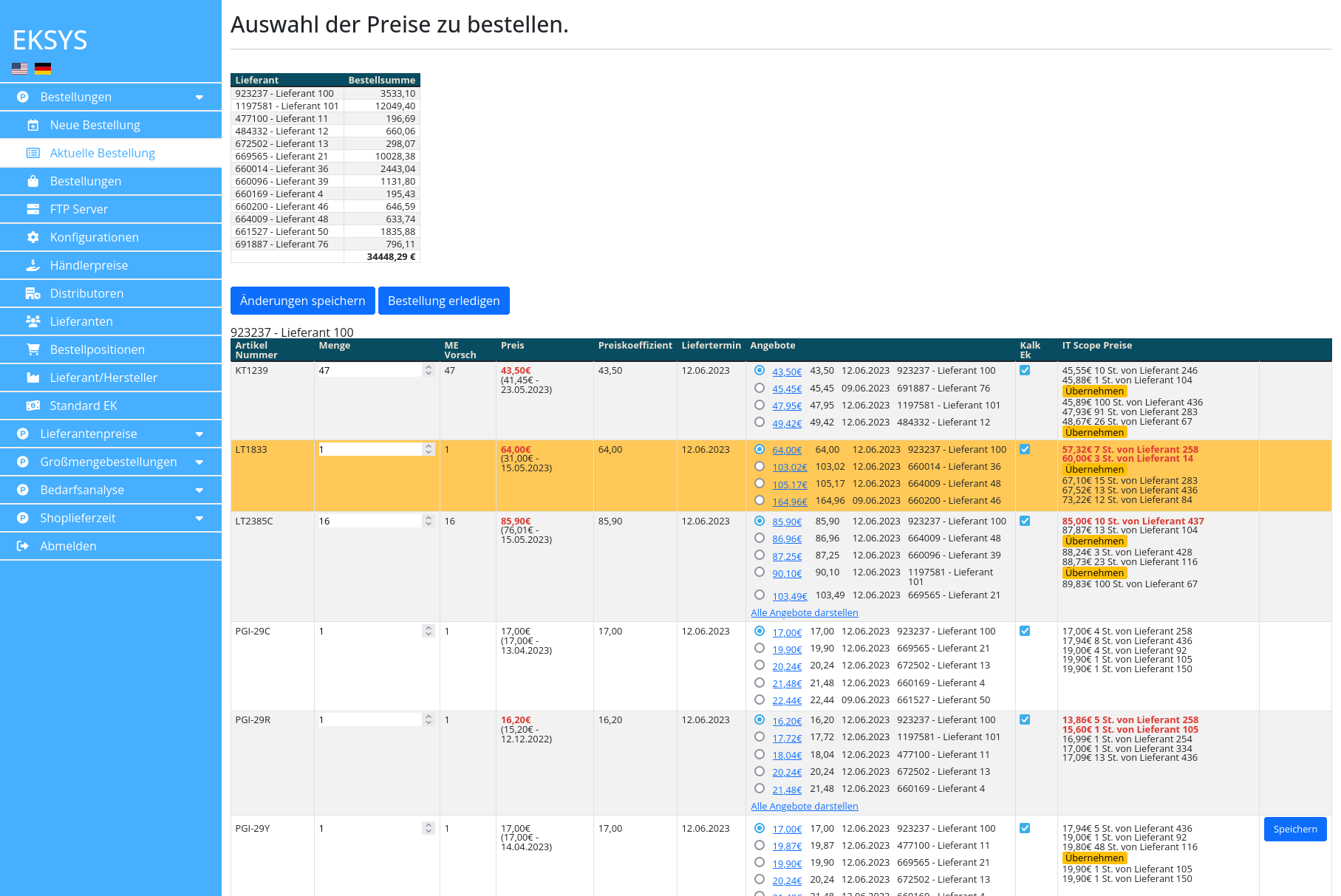 Když vyprší čas aukce, získá nákupčí přehled nabídek. Přehled je seskupen podle dodavtelů. EkSys vytvoří návrh, u kterého dodavatele by se měl který výrobek nakoupit. Nákupčí může tendo návrh libovolně pozměňovat.