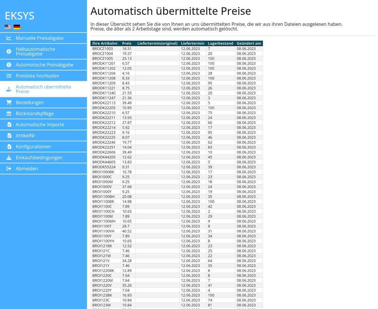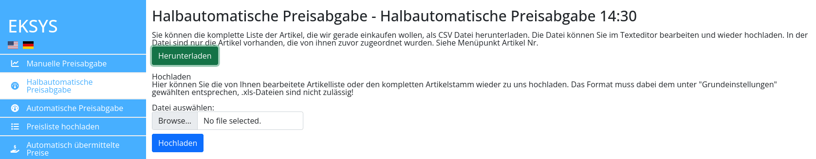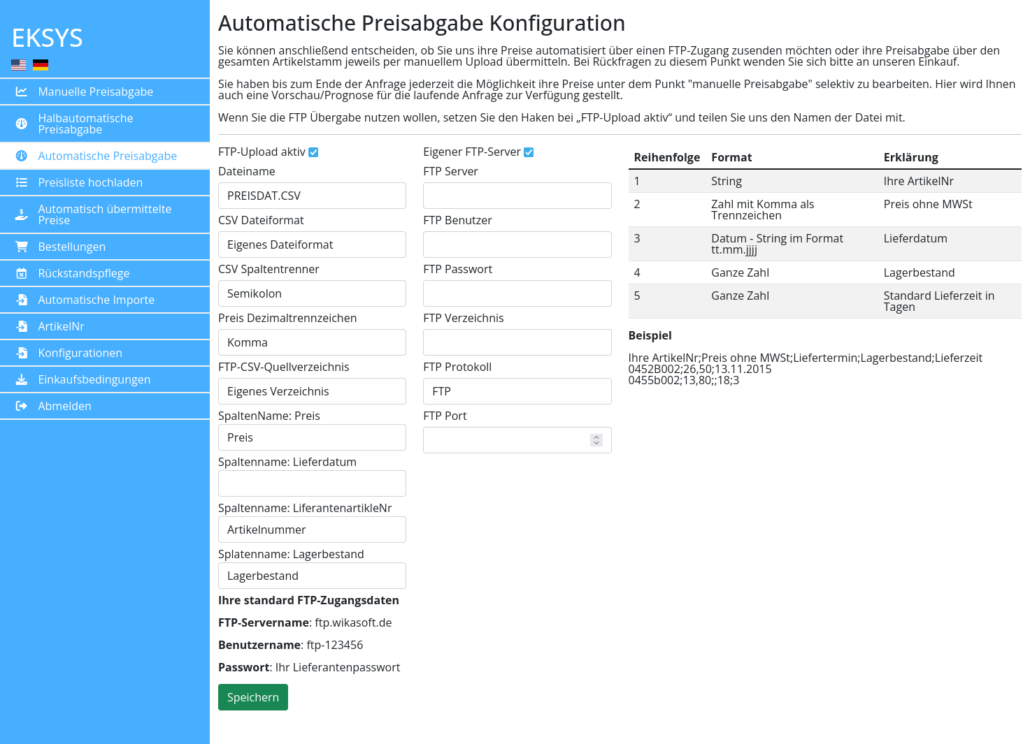 Třetí možností je automatické předávání cen v CSV souboru. Soubor se automaticky vyčítá z FTP serveru. Soubor musí být ve formátu CSV. Dodavatel určuju, z jakého FTP Serveru se má soubor vyčítat a jaký má formát (oddělovač sloupců, oddělovač desetinných míst, jména sloupců pro cenu, kód výrobku, datum doručení, stav na skladě). V jiné obrazovce vidí dodavatel, jaké ceny jsou u něho uloženy a kdy byly načteny.