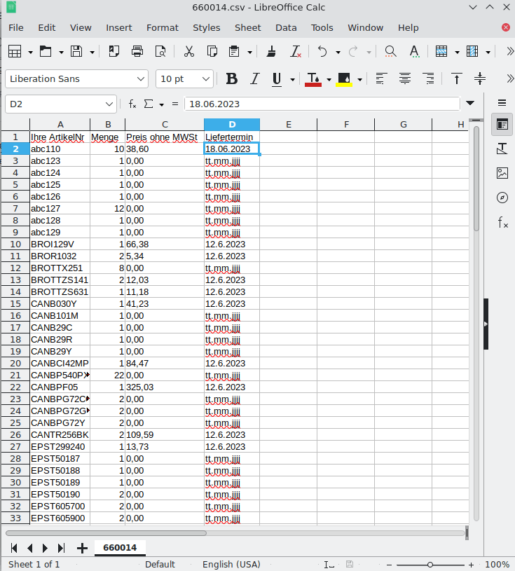 Druhá možnost, jak může dodavatel odevzdat cen, je CSV soubor. Ve webovém rozhraní je možnost stáhnout seznam požadovaných výrobků v CSV formátu. Soubor může být otevřen například v Mircrosoft Excelu. Po zadání cen a datumů doručení se souboru opět nahraje ve webovém rozhraní.