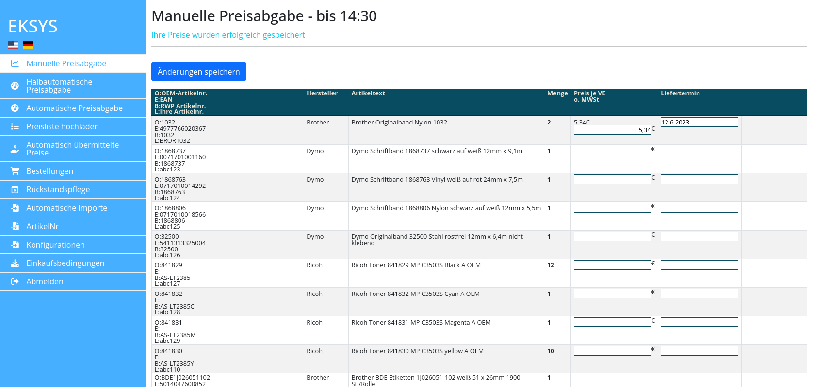 První možnost, jak může dodavatel odevzdat ceny, je ruční zadání. Dodavatel se přihláší do webového rozhraní a ručně zadá své ceny ve formuláři.