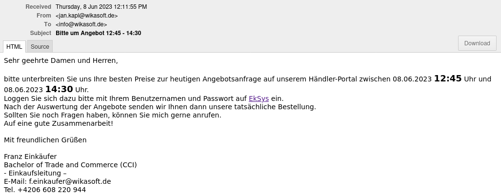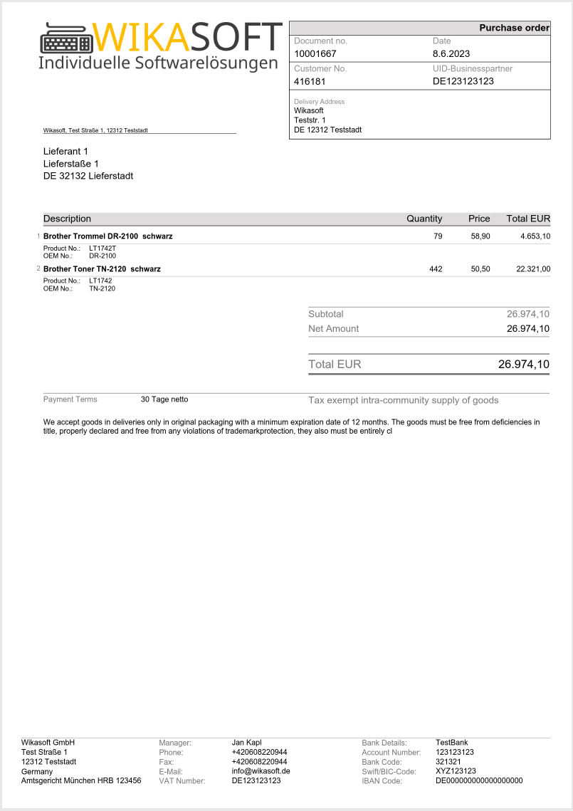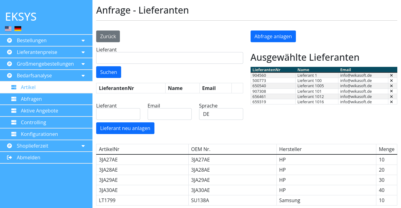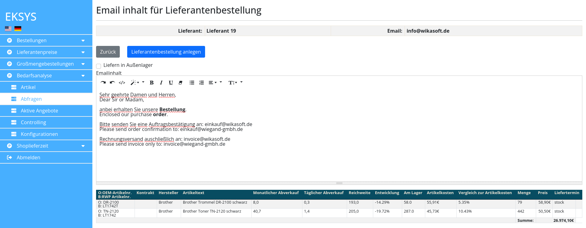 Když nákupčí objedná příslušné výrobky, dostanou dodavatelé email s objednávkou. Současně předává EkSys dodavatelské objednávky do účetnictví.