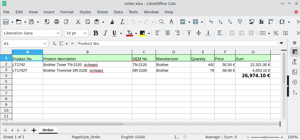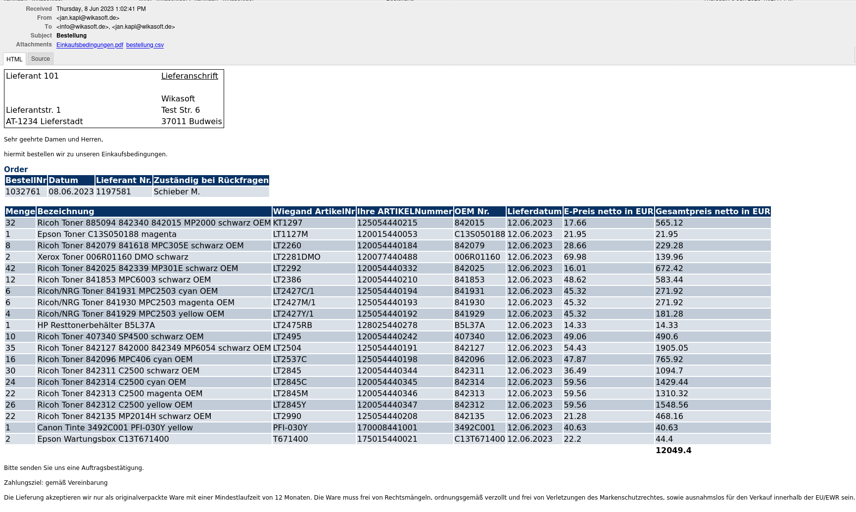 Dodavatel obdrží email s objednávkou. Objednávka je obažena v PDF a XLSX formátu.