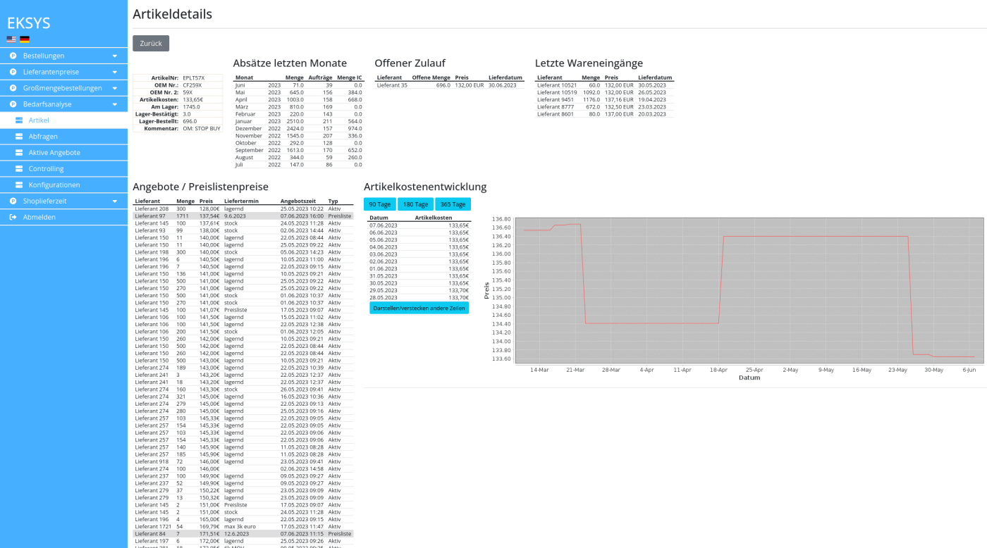 Ke každému výrobku existuje tato obrazovka, která zobrazuje detailni informace. Tato historická data slouží nákupčímu jako rozhodvací báze, zda má být výrobek nakoupen.