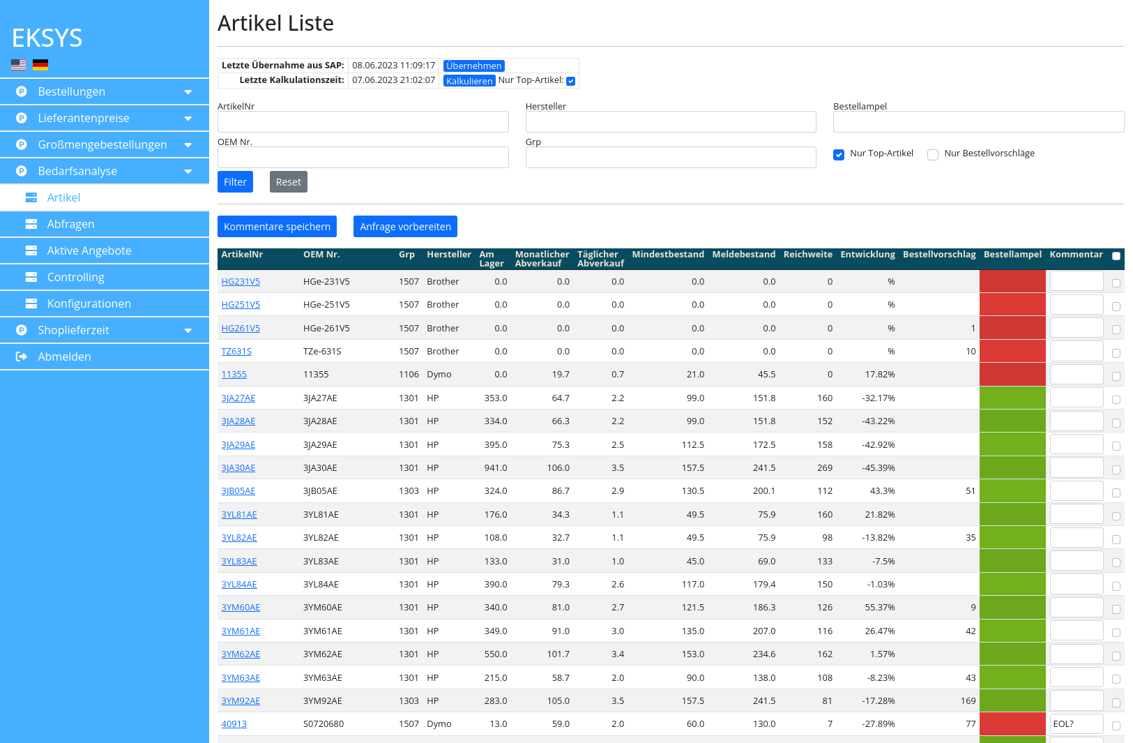 Nákupčí musí denně posuzovat, které položky chybí (v zákaznických objednávkách) a které je třeba objednat předem. EkSys přebírá stav na skladě, otevřené objednávky zákazníků a otevřené objednávky dodavatelů z účetnictví (SAP). Z těchto údajů se počítají požadavky na objednávky u dodavatelů.