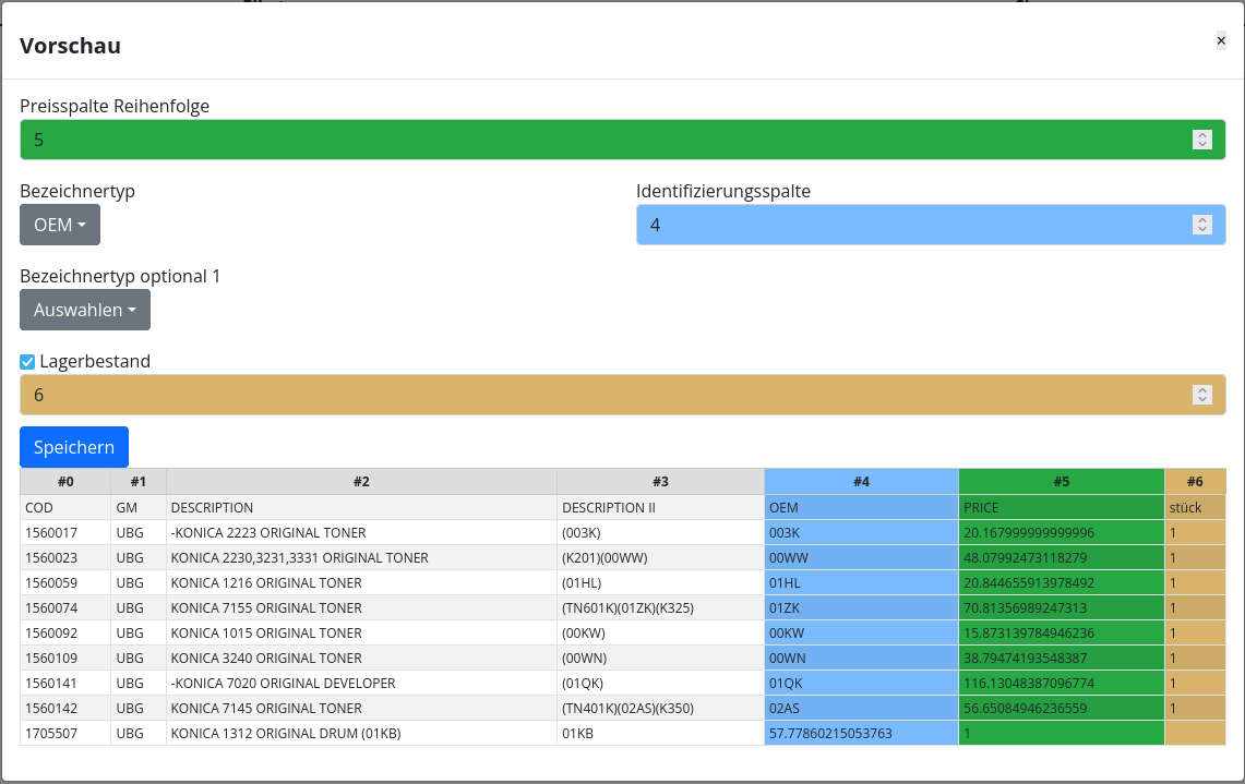 Nákupčí vezme ceník v excelu a nahraje ho do aplikace. První věc, kterou je třeba udělat, je určení sloupců. V náhledu je vidět pár prvních řádek ze souboru. Pořadových číslem se určí, který sloupec obsahuje cenu. Nejtěší věci na celém procesu je přiřazení řádek vlastním výrobkům. V idealním případě obsahuje ceník čísla výrobků prodejce (což tak typicky není). Dobře fungující atributy pro přiřazování jsou OEM a EAN čísla. V této obrazovce je možno přiřadit oba tyto atributy. Jestliže zbyde nějaká řádka nepřiřazena, má uživatel možnost, tuto řádku přiřadit ručně. Poslední sloupec k určení je stav na skladě (když je obsažen).