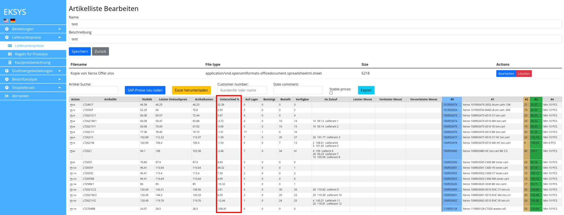 Jestliže je úspěšně dokončena přiřazovací konfigurace, zobrazí se uživateli tato obrazovka. V lévé části jsou zobrazeny informace z vlastního datového stavu, v pravé části informace z ceníku. Jestliže nebyl nějaká řádka automaticky přiřazena, je namísto čísla produktu zobrazeno políčko na jeho zadání. Důležitou informací jsou vlastní (poslední) nákupní ceny. K tomu je ještě zobrazen stav na skladě, "na cestě" a prodeje v posledních měsících (rozhodovací kritérim potřeby nákupu). Nejdůležitější informací je "Rozdíl %". Je to porovnání mezi cenou v ceníku a aktuální(poslední) nákupní cenou prodejce. Takto může nákupčí rychle posoudit, jak zajímavé jsou nabízené ceny. Z důvodu dalží analyzy je možno tato data stáhnout ve formátu excel. Jestliže jsou ceny zajímavé, může je nákupčí exportovat pro další zpracování. Z takto exportovaných dat může aplikace jednoduše založit objednávku (poslat jí emailem dodavateli a předat do vlastního účetnictí).
