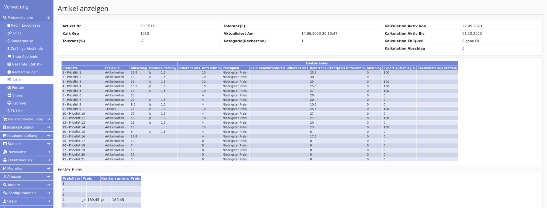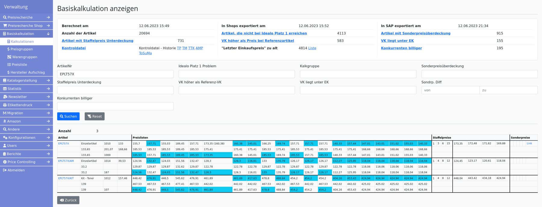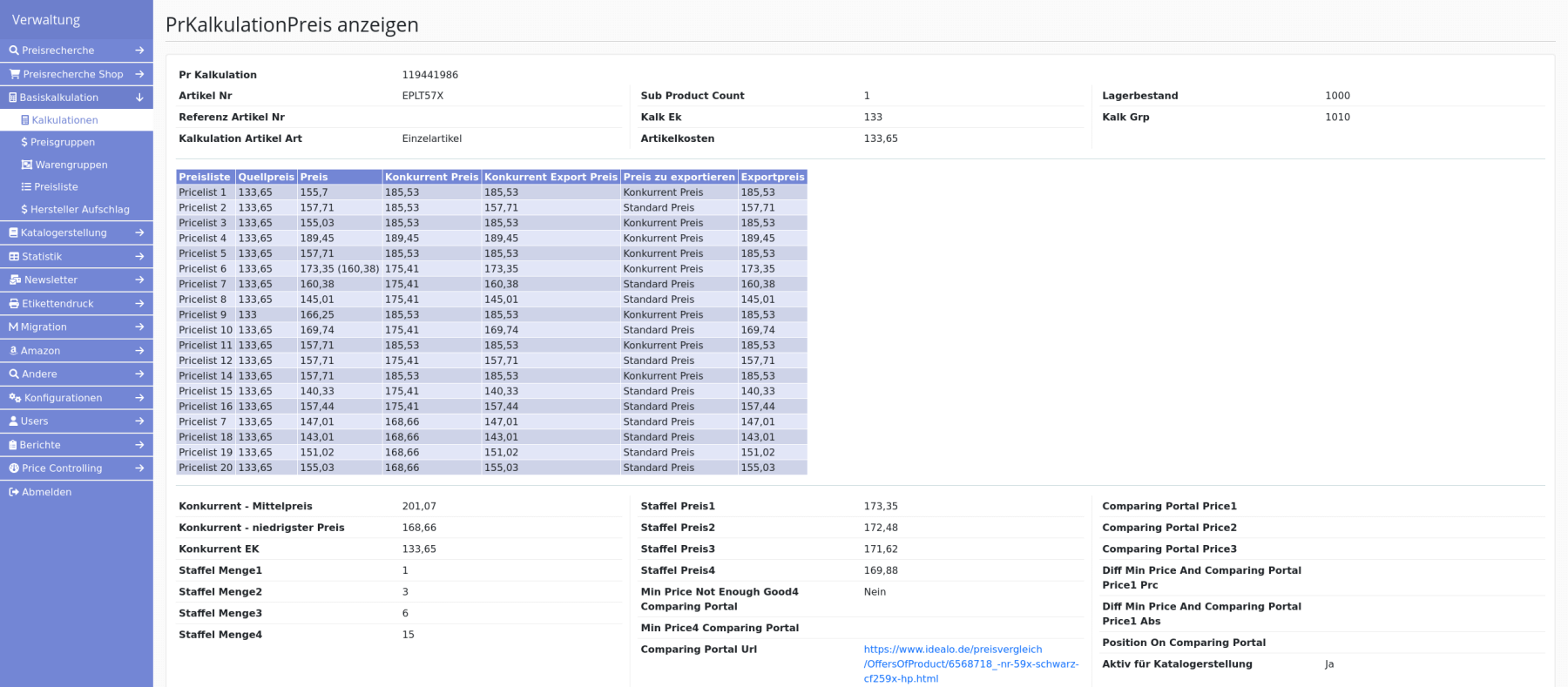 Jednou denně, když dodavatelé odevzdají svoje ceníky a obchodník má akutální ceny, napočte systém automaticky tuto cenovou kalkulaci (pochopitelně, nápoečet této kalkulace se může kdykoli spustit ručně). Odpovědný pracovní se na kalkulaci podivá a zkontroluje různě věci. Když je s výsledkem spokojen, exportuje kalkulaci do eShopu a do účetnictví. Existuje vícero kontrolních seznamů, které poukazují na potencionální problémy. Například, když je prodejní cena nižší než nákupní (což může být u ležáku v pořádku). Pracovní si prohlídne seznamy výrobků s potenciálními problémy. Může změnit nějaké parametry a kalkulaci nechat spočítat znovu. Pro lepší orientaci v cenové situaci si může stáhnout Excel s historickými daty.